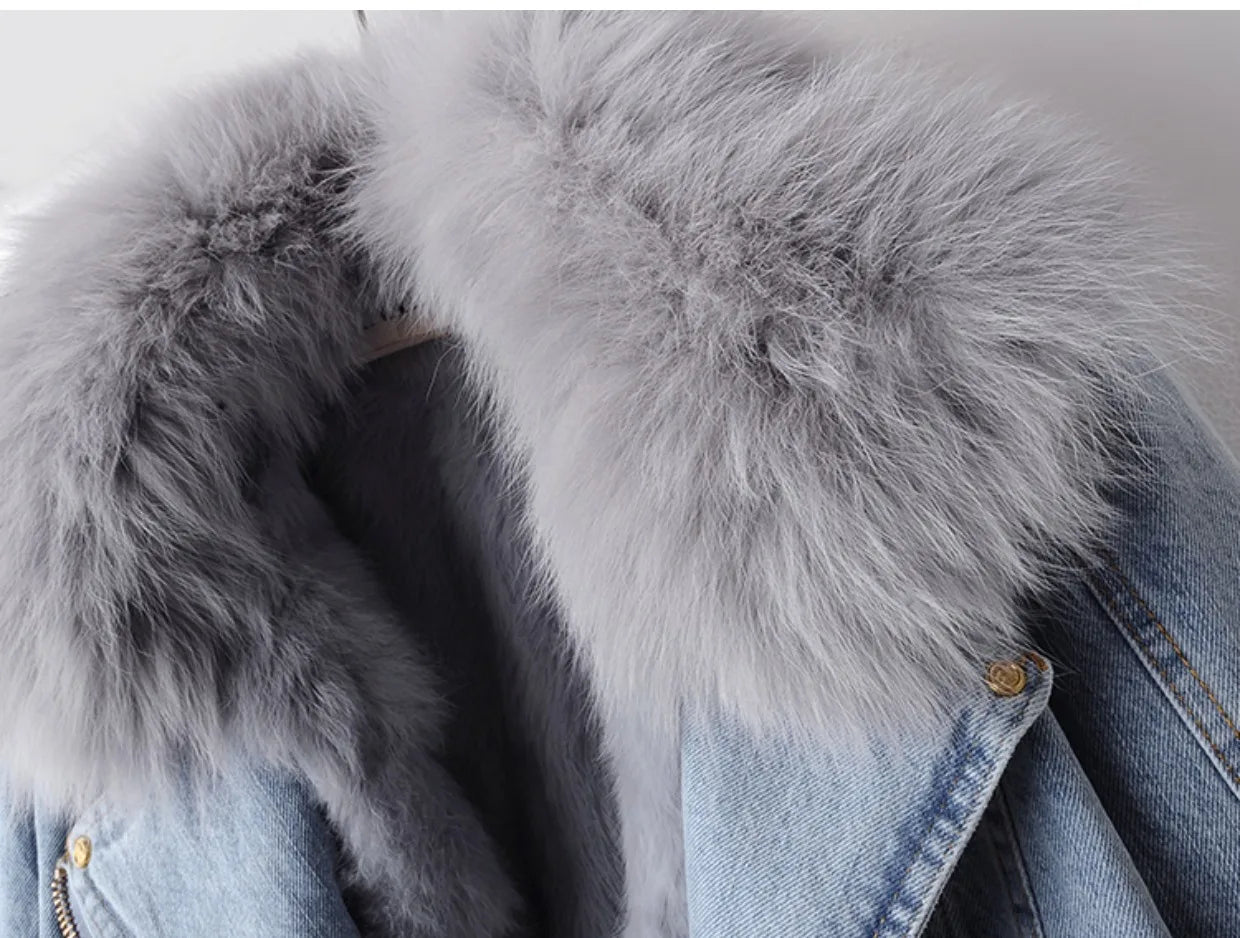 Betreed de wereld van tijdloze mode en comfort met ons denim jasje, afgewerkt met luxueus nepbont aan de binnenkant, kraag en aan het einde van de mouwen. Deze veelzijdige jas belichaamt een harmonie tussen stijl en warmte, waardoor het een onmisbare toevoeging is aan je garderobe.