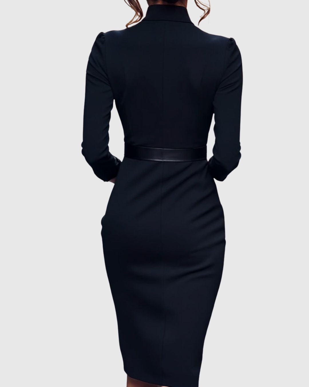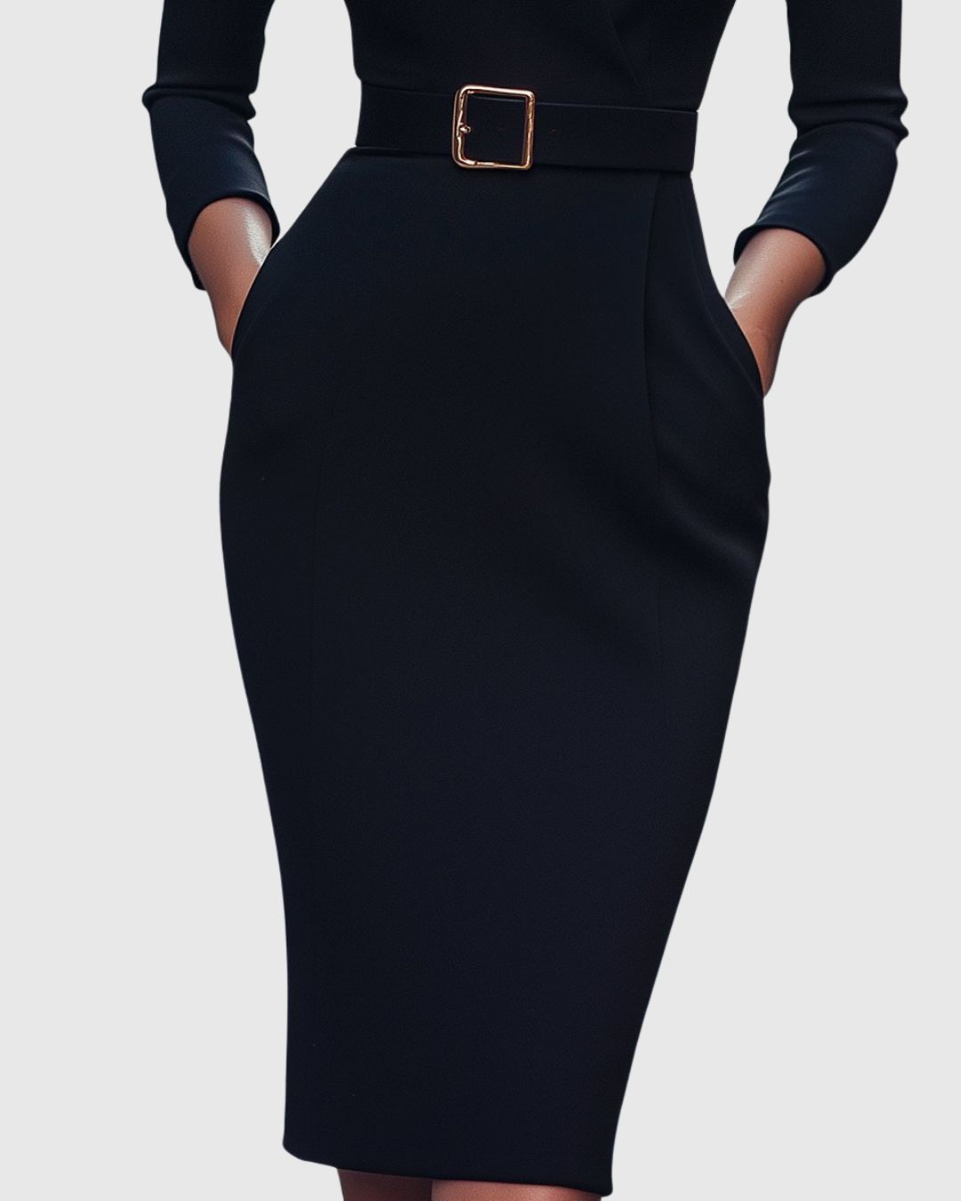 Un collo a mock-wrap incornicia il décolleté, le maniche a 3/4 offrono una copertura elegante e una gonna a tubino rifinita allunga la figura. La cintura coordinata con fibbia quadrata stringe la vita alla perfezione, mentre le spalle delicatamente definite scolpiscono la linea superiore. Realizzato in un tessuto di alta qualità, leggermente elastico, drappeggia magnificamente, si muove con te e resiste alle pieghe. Tasche laterali discrete aggiungono praticità senza disturbare il profilo slanciato.